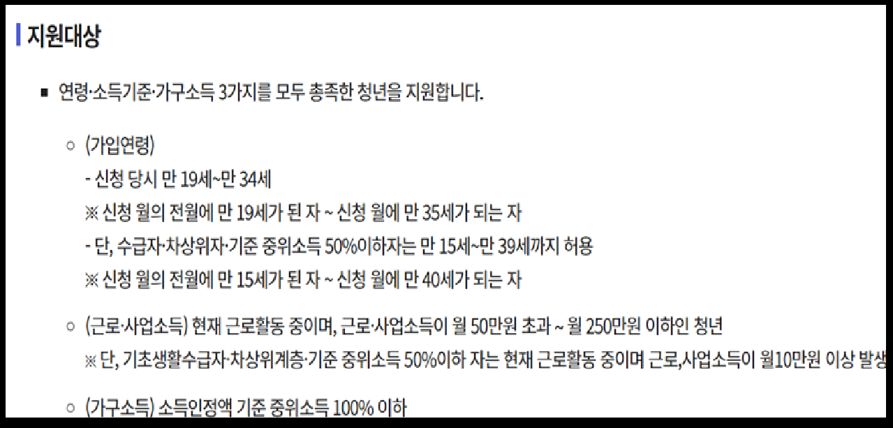 - ✔️ 조건: 나이 + 소득 + 근로 충족 (중위소득 100% 이하)