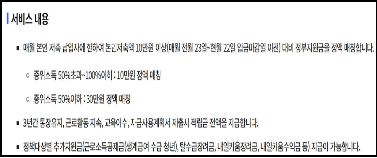 - ✔️ 지원: 월 10만 원 저축 시, 정부 추가 지원 월 10~30만 원